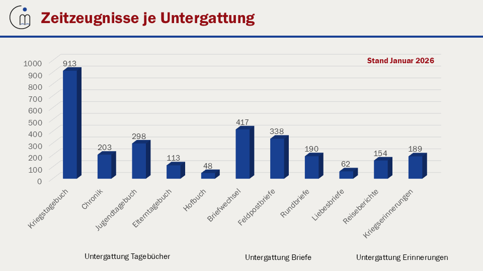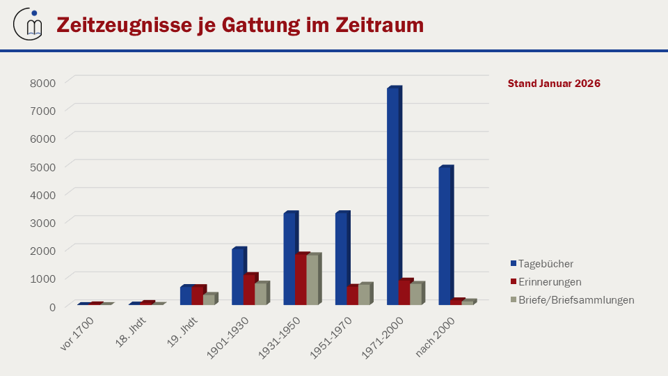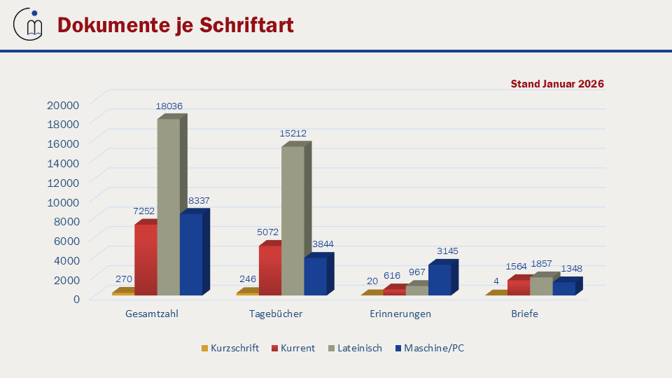 Das Tagebucharchiv in Zahlen(Zahlen der Tabelle: Stand Januar 2026 – Diagramme: Stand siehe Angabe im Diagramm) |