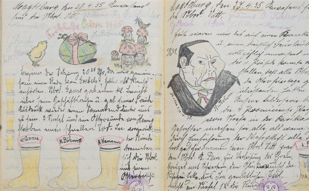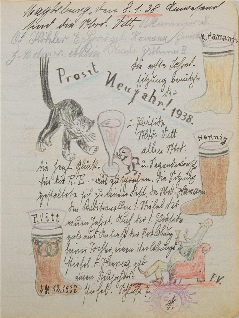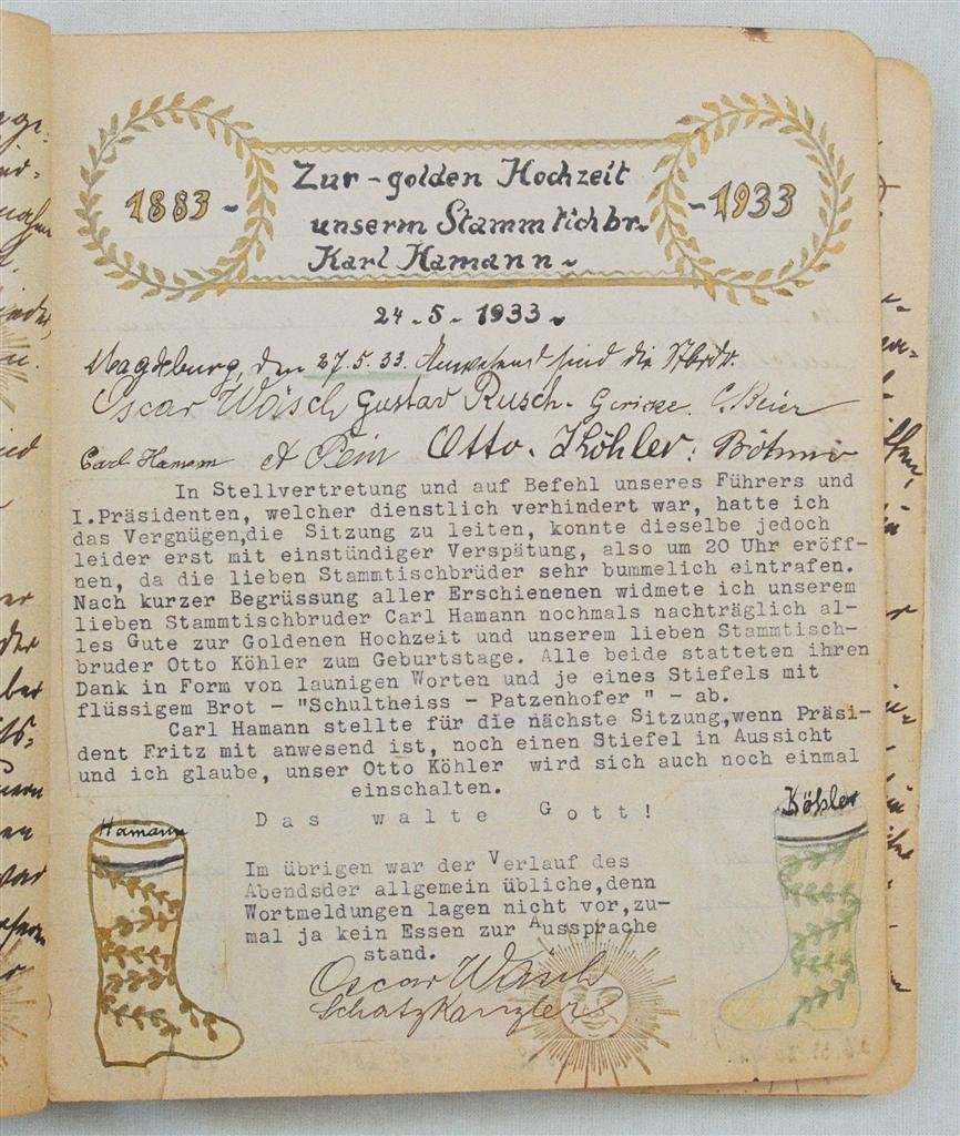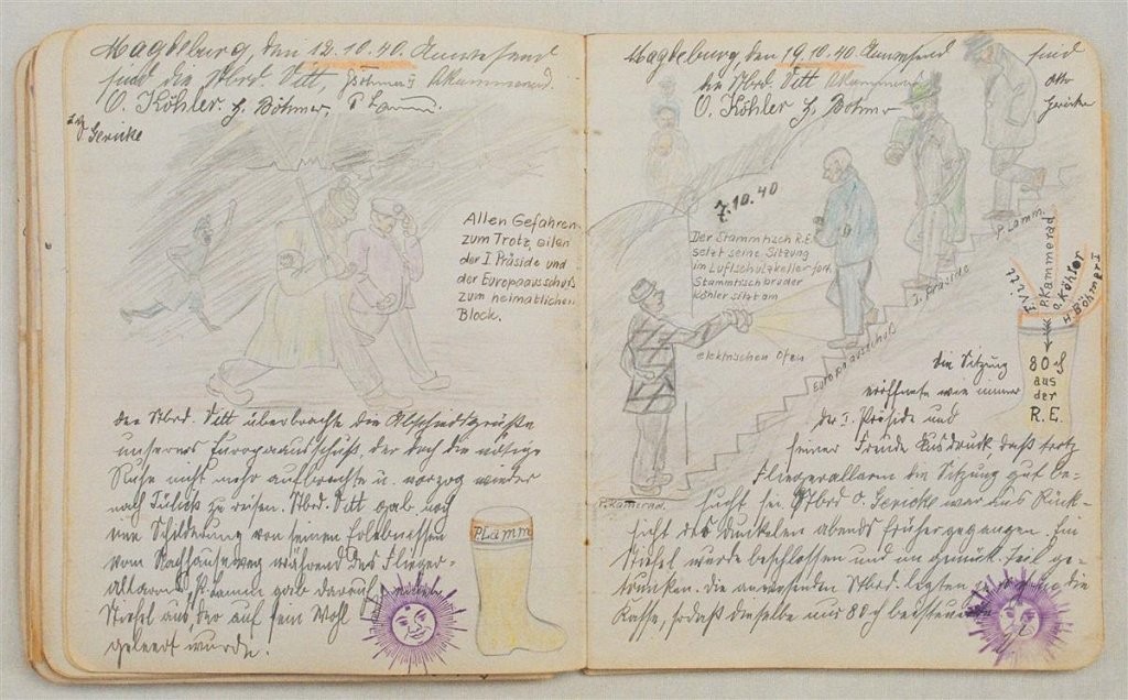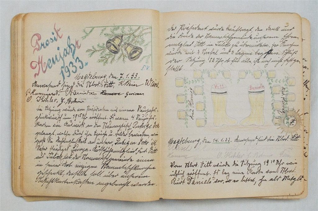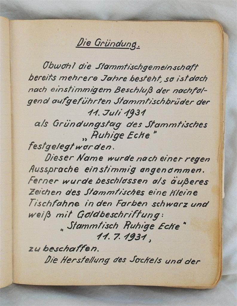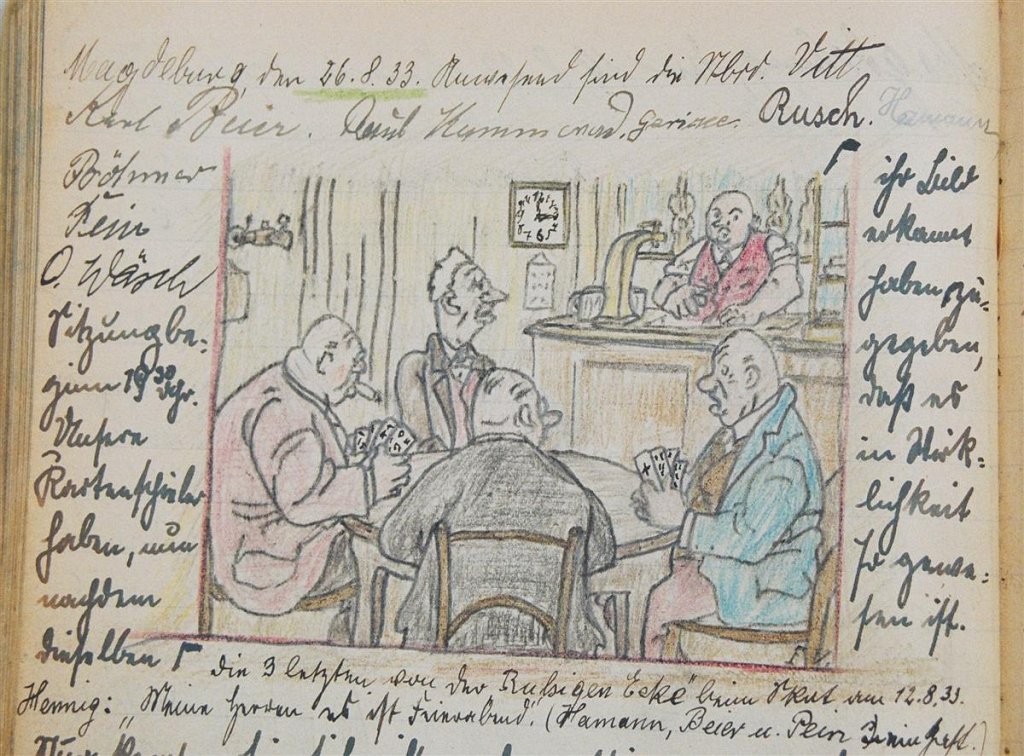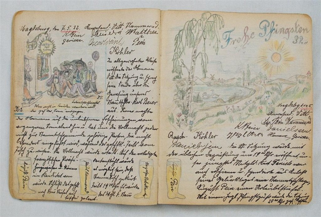 Am 11. Juli 1931 wird die Stammtischgemeinschaft „Ruhige Ecke“ in Magdeburg gegründet. Die wöchentlichen Sitzungen der 14 Mitglieder werden bis Dezember 1941 in zwei dicken Kladden protokolliert. Die beiden Protokollhefte sind mit vielfältigen Zeichnungen, Karikaturen und „Bierstiefel“ ausgestaltet (DTA 3086).