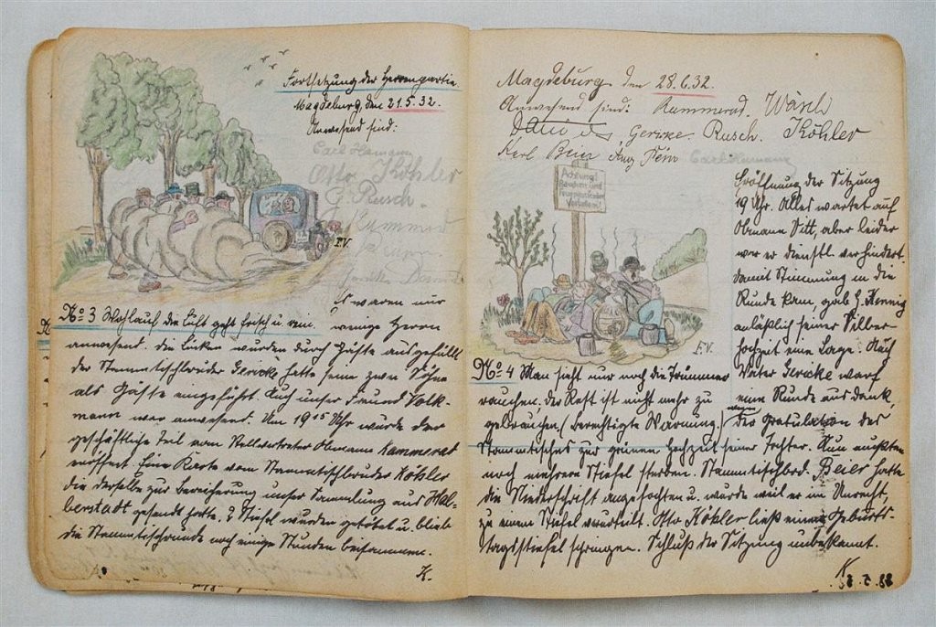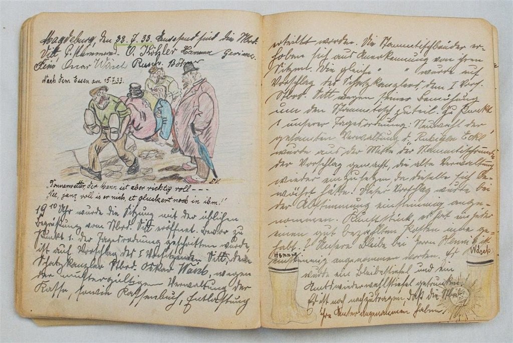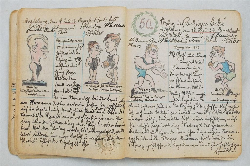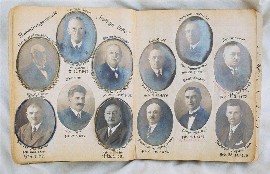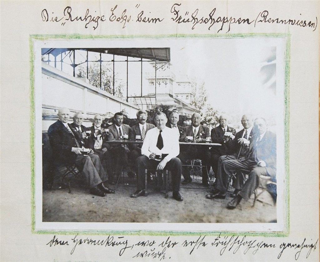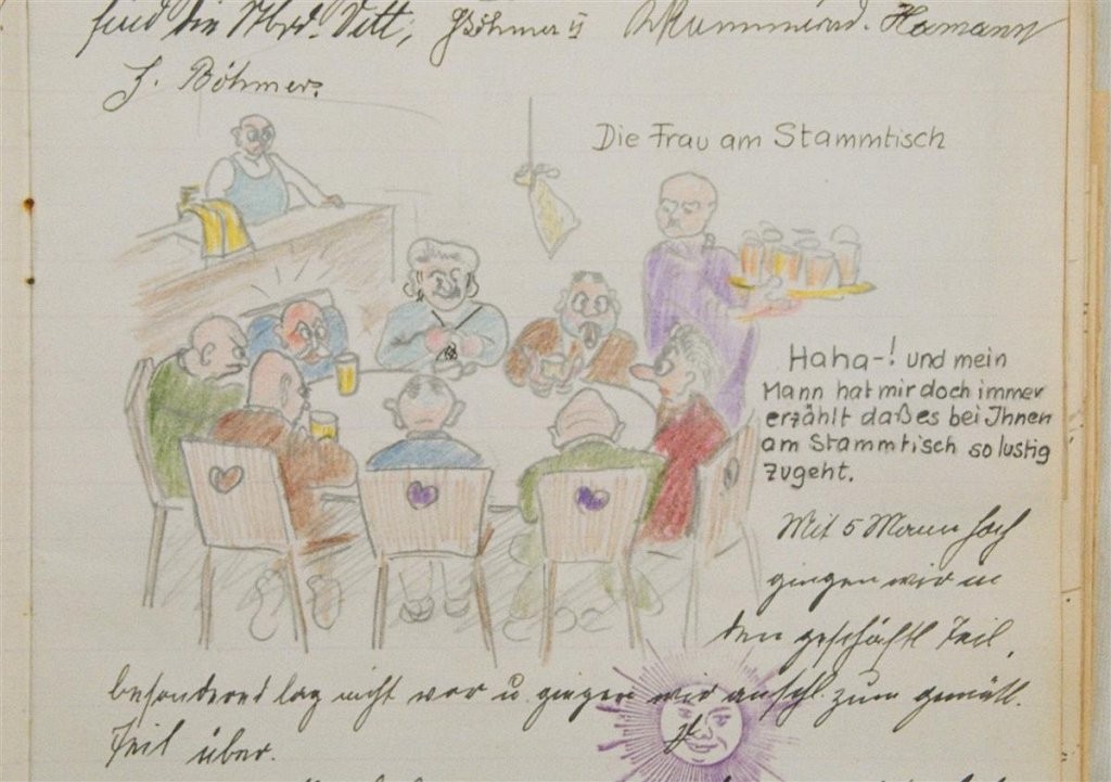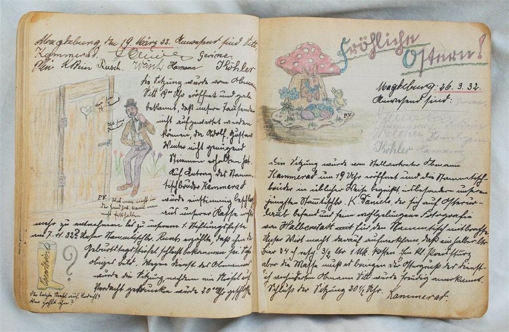 Am 11. Juli 1931 wird die Stammtischgemeinschaft „Ruhige Ecke“ in Magdeburg gegründet. Die wöchentlichen Sitzungen der 14 Mitglieder werden bis Dezember 1941 in zwei dicken Kladden protokolliert. Die beiden Protokollhefte sind mit vielfältigen Zeichnungen, Karikaturen und „Bierstiefel“ ausgestaltet (DTA 3086).