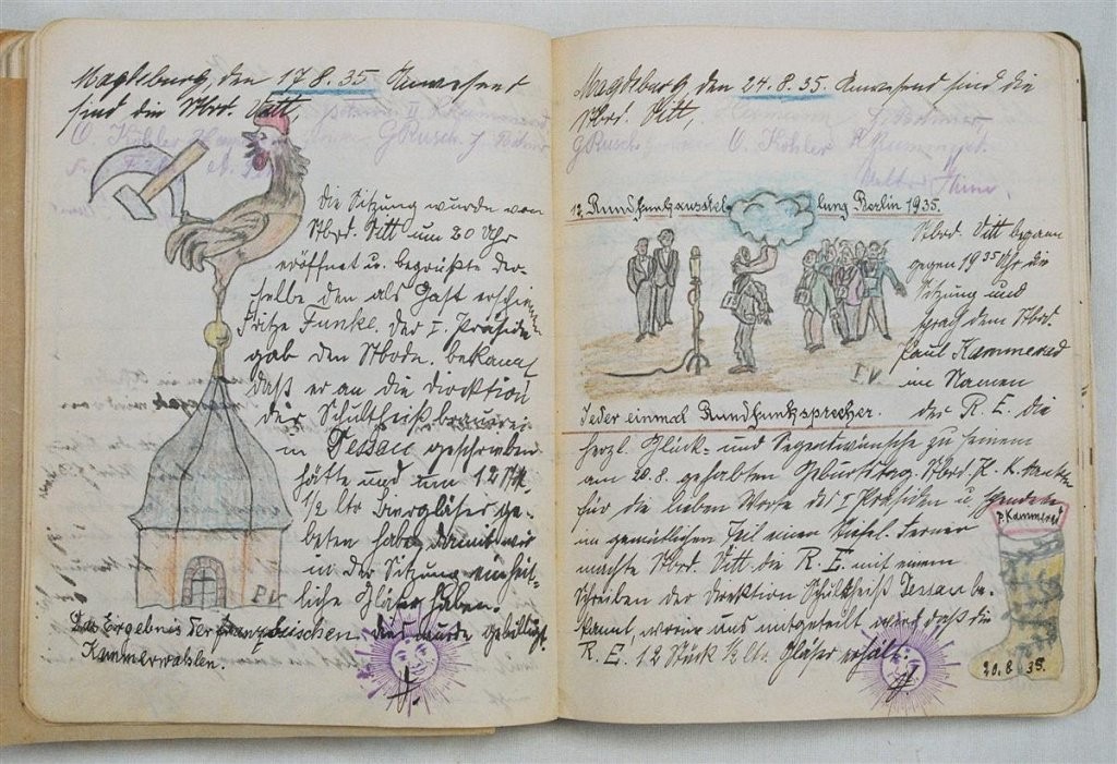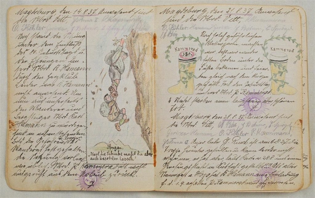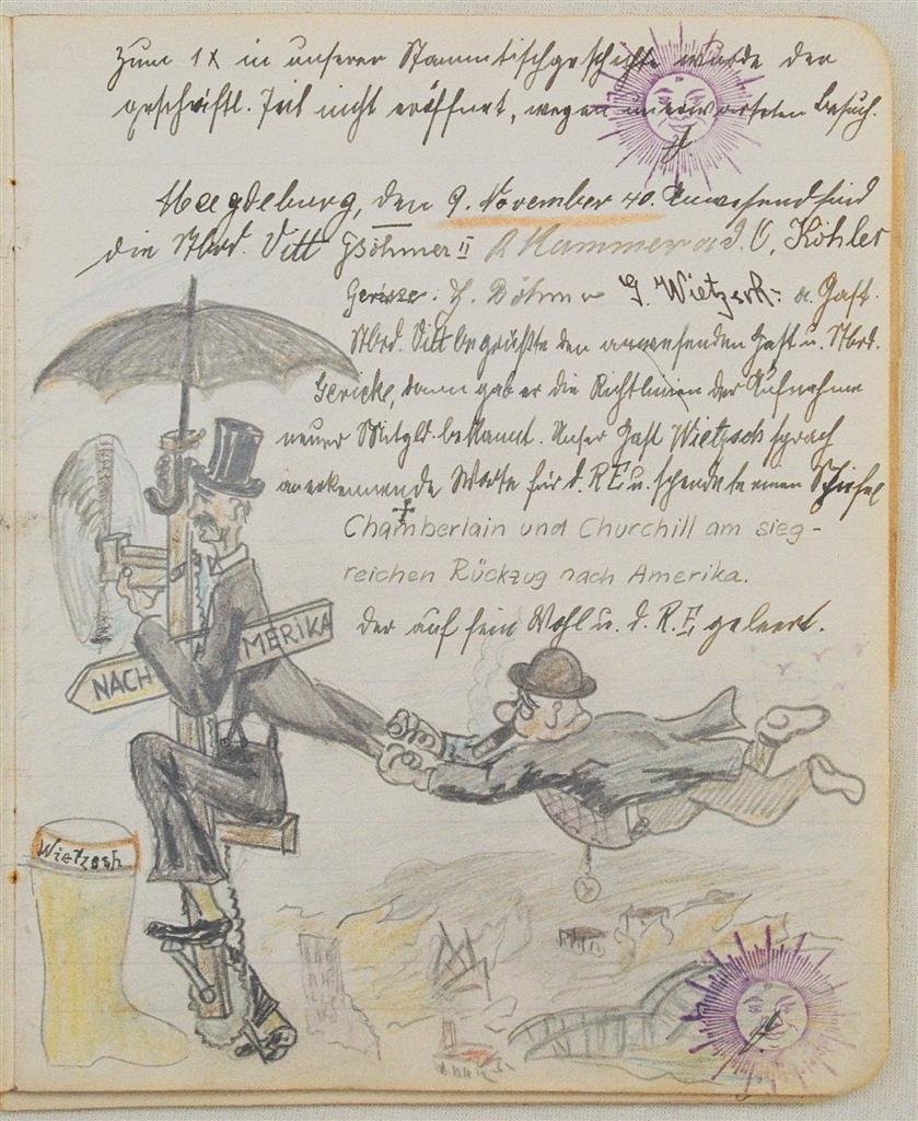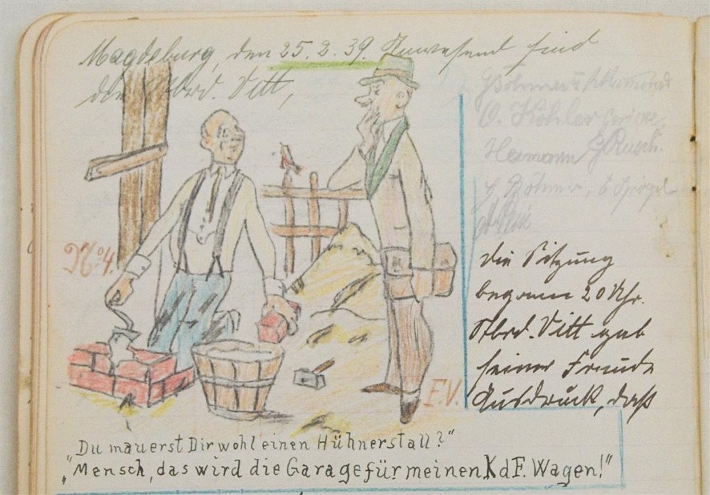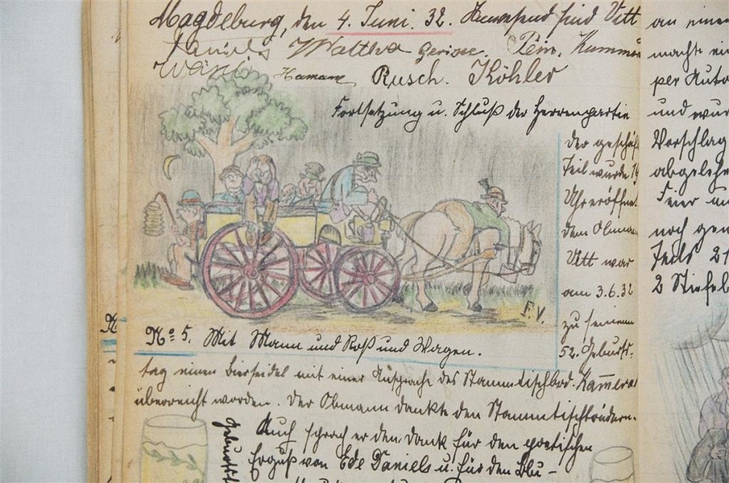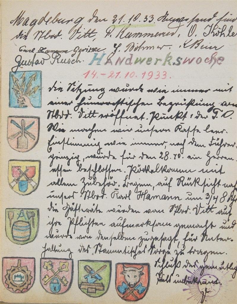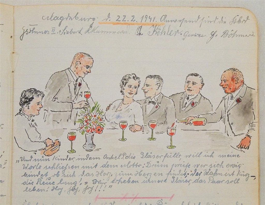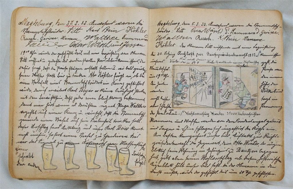 Am 11. Juli 1931 wird die Stammtischgemeinschaft „Ruhige Ecke“ in Magdeburg gegründet. Die wöchentlichen Sitzungen der 14 Mitglieder werden bis Dezember 1941 in zwei dicken Kladden protokolliert. Die beiden Protokollhefte sind mit vielfältigen Zeichnungen, Karikaturen und „Bierstiefel“ ausgestaltet (DTA 3086).