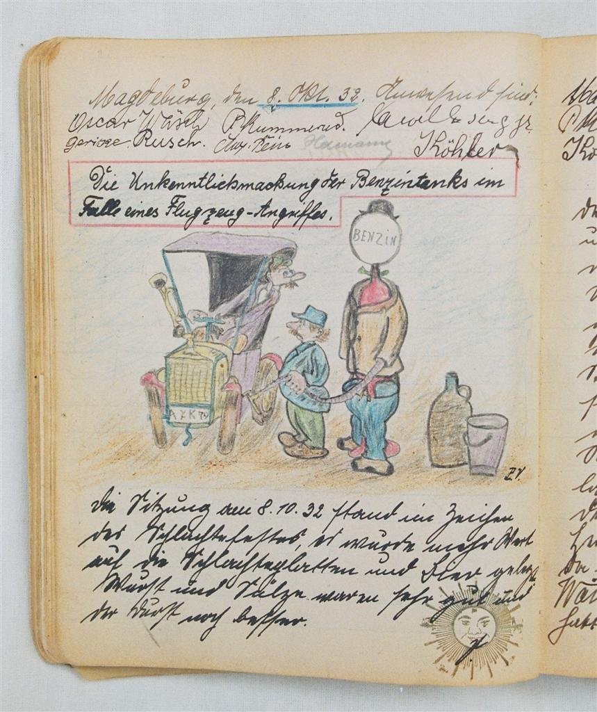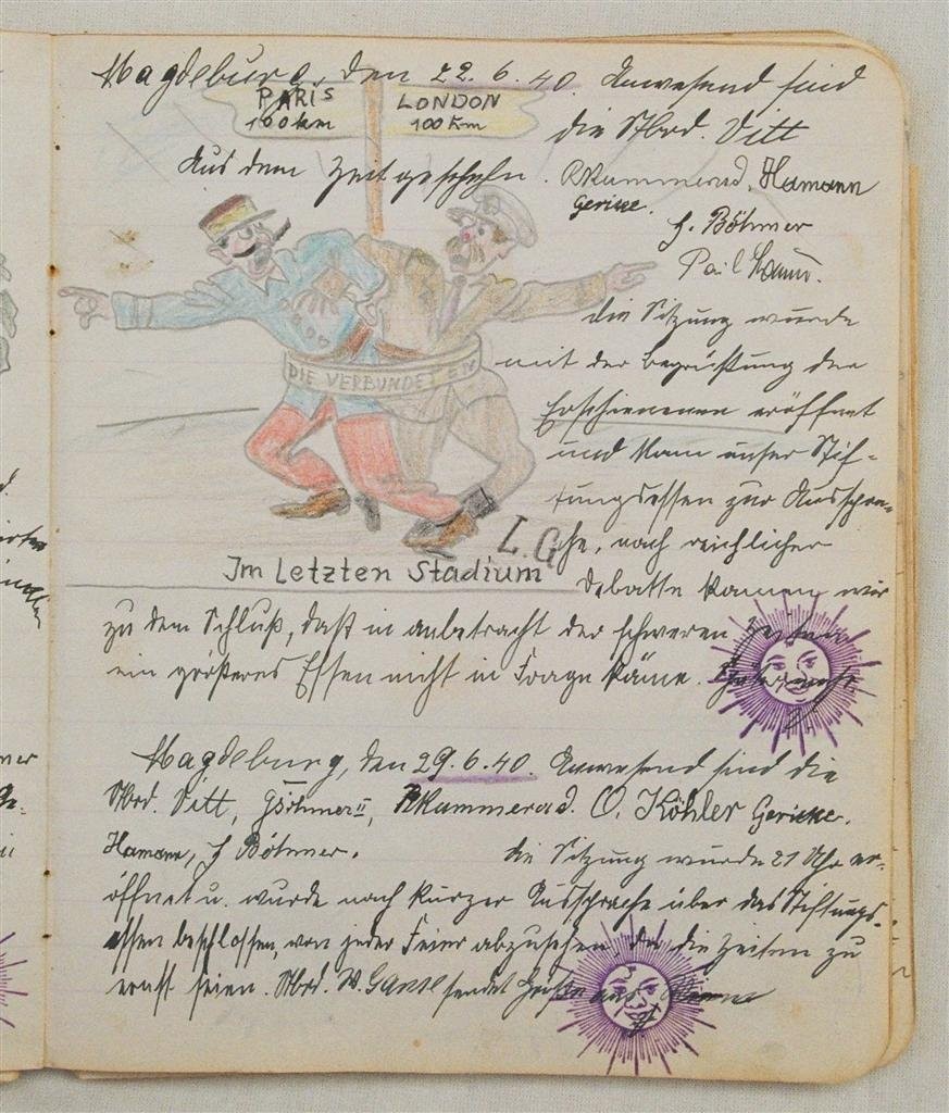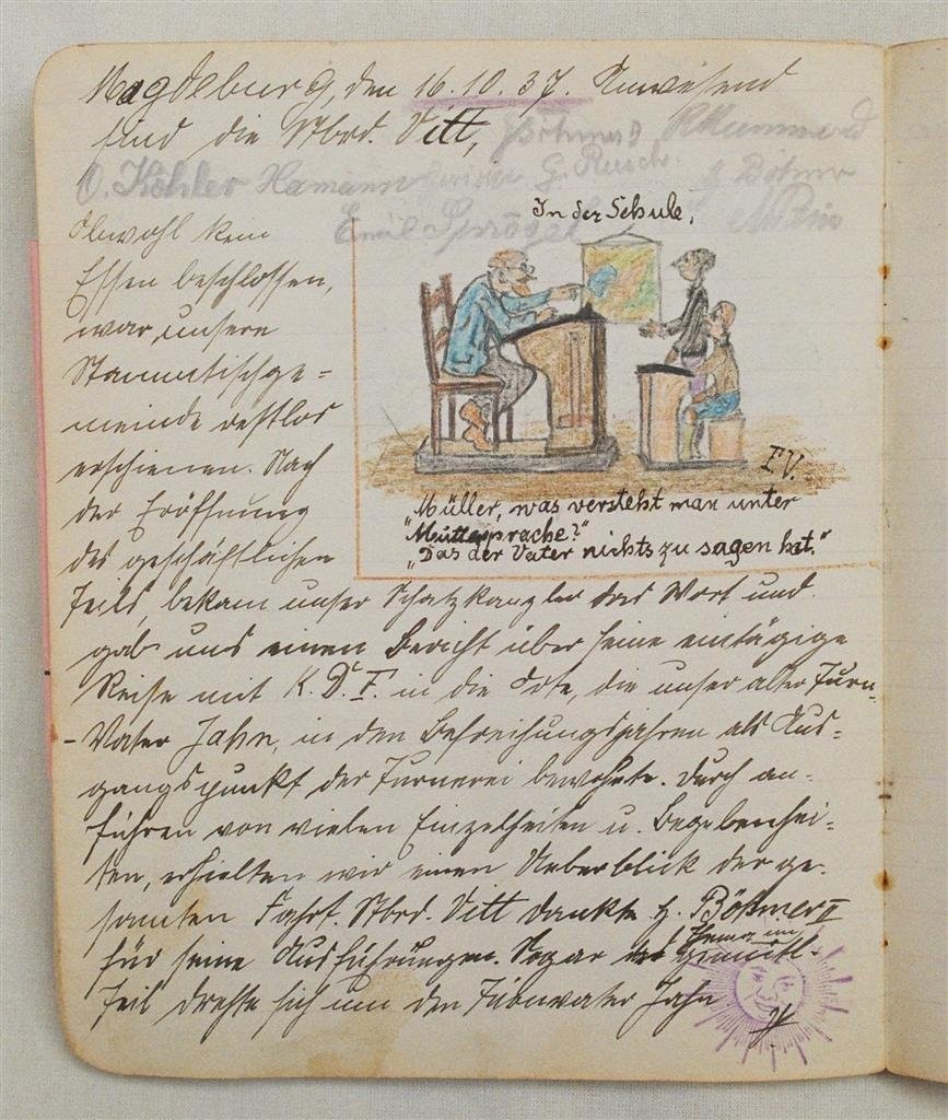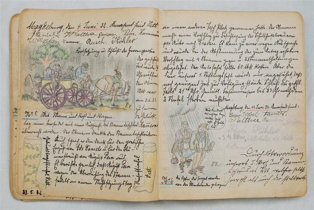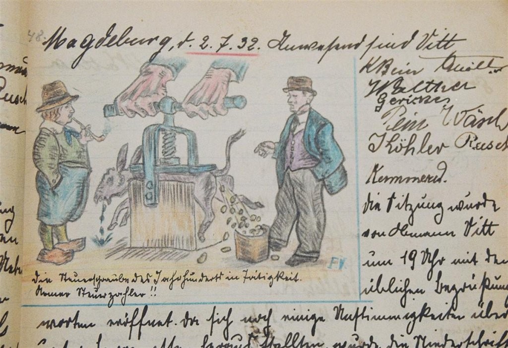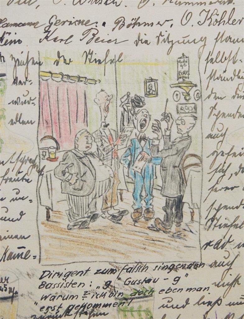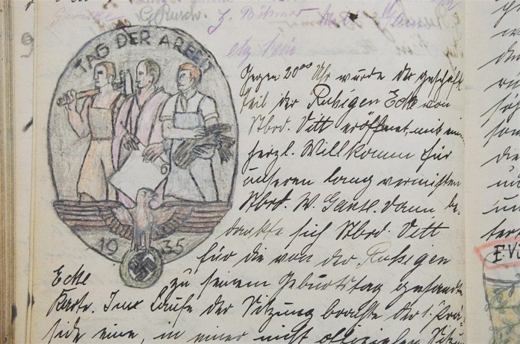 Am 11. Juli 1931 wird die Stammtischgemeinschaft „Ruhige Ecke“ in Magdeburg gegründet. Die wöchentlichen Sitzungen der 14 Mitglieder werden bis Dezember 1941 in zwei dicken Kladden protokolliert. Die beiden Protokollhefte sind mit vielfältigen Zeichnungen, Karikaturen und „Bierstiefel“ ausgestaltet (DTA 3086).