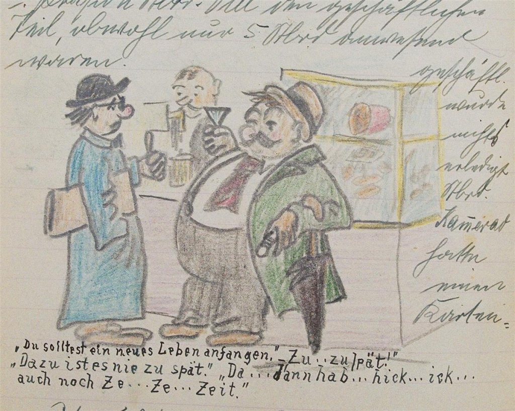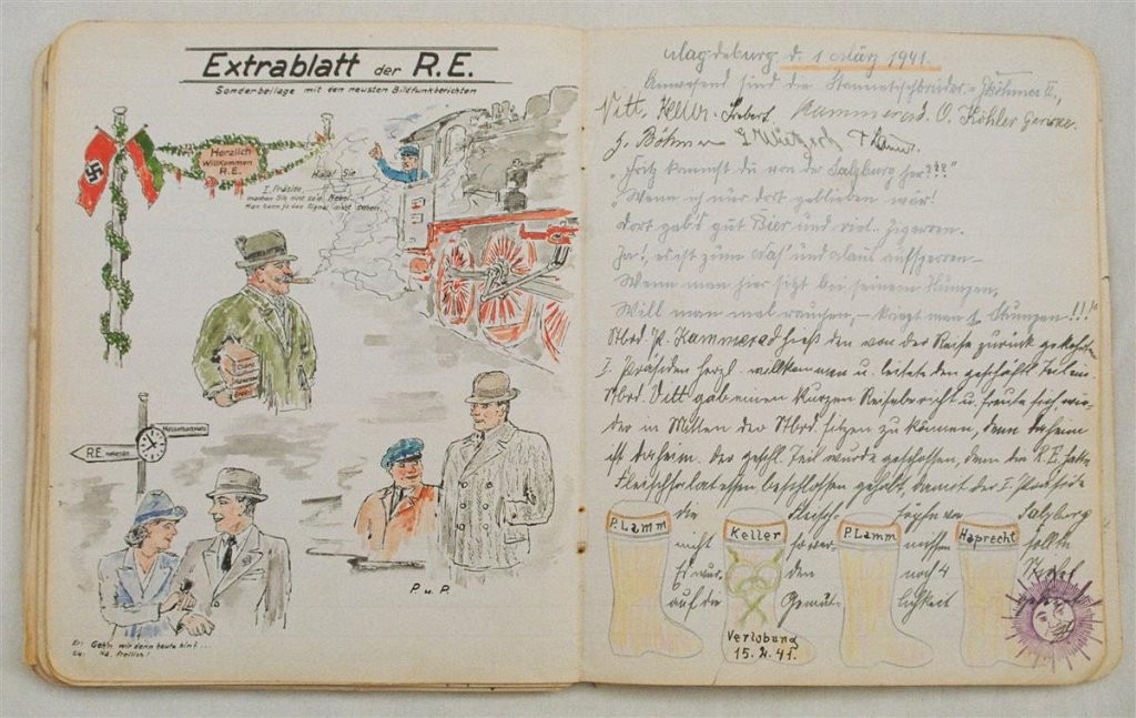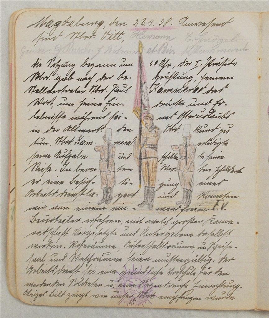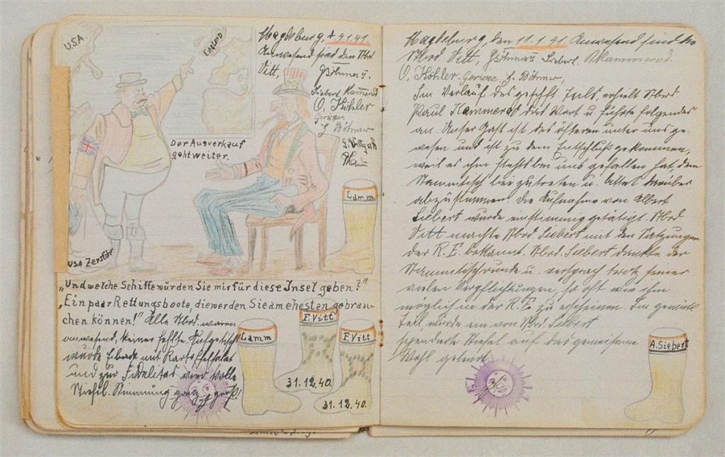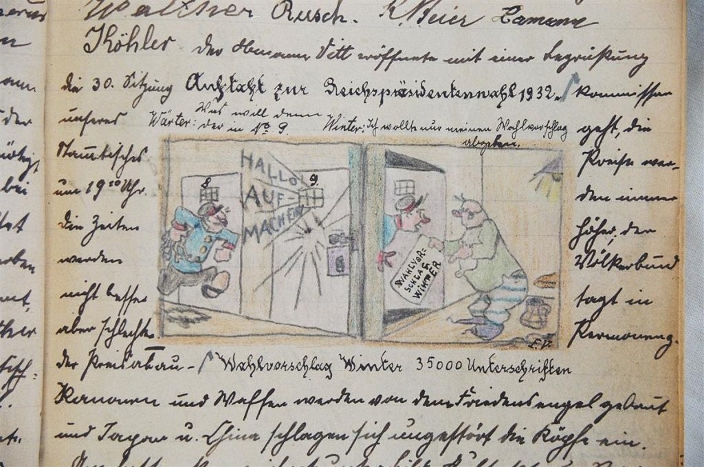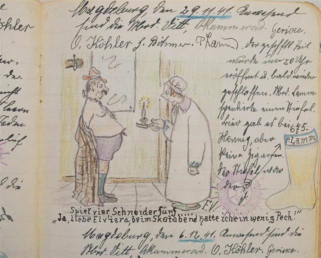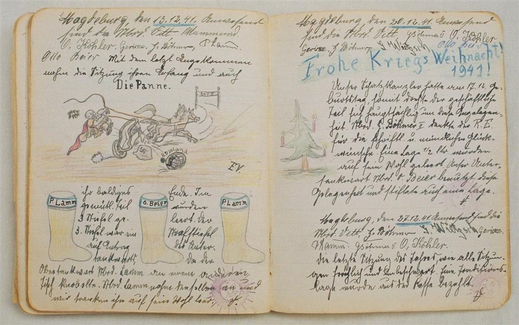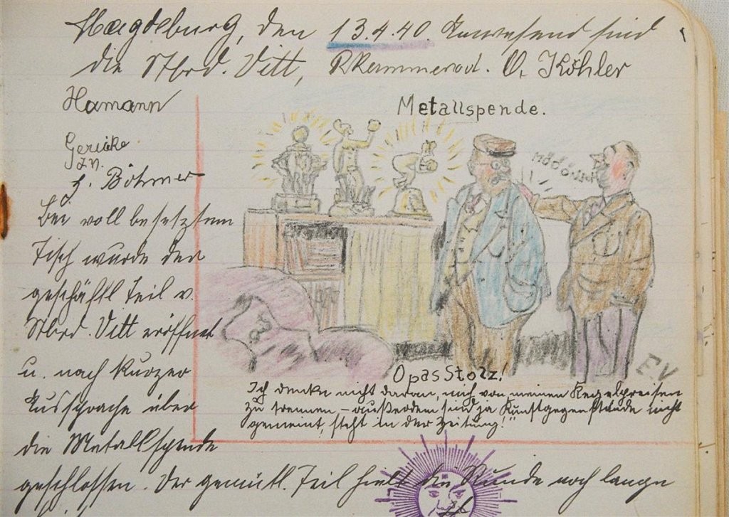 Am 11. Juli 1931 wird die Stammtischgemeinschaft „Ruhige Ecke“ in Magdeburg gegründet. Die wöchentlichen Sitzungen der 14 Mitglieder werden bis Dezember 1941 in zwei dicken Kladden protokolliert. Die beiden Protokollhefte sind mit vielfältigen Zeichnungen, Karikaturen und „Bierstiefel“ ausgestaltet (DTA 3086).